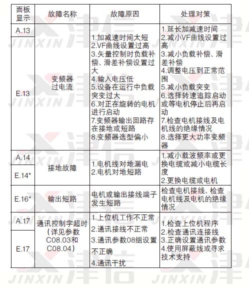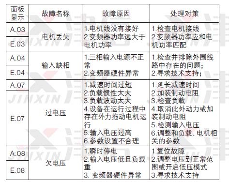 故障說明變頻器由於某種原因已經超過設計極限,故障發生後變頻器跳脫,必須複位才能重新運行。故障產生時,麵板顯示“E.XX”(XX指數字)。