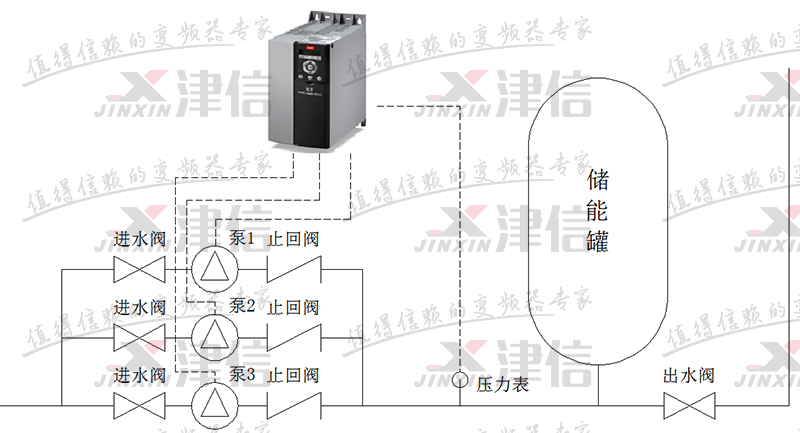 FC111固定模式多泵控製中,變頻器直接控製變頻泵,其他泵的起停由變頻器的數字量輸出信號控製,主要完成以下功能: